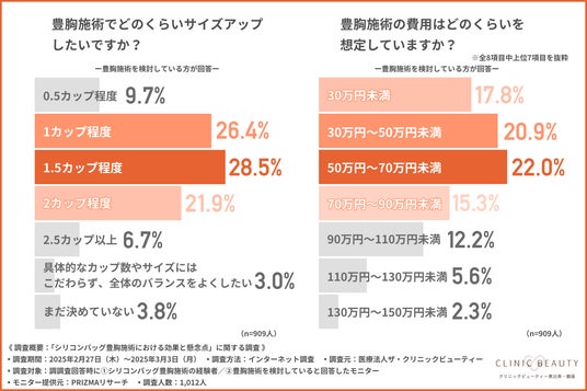 豊胸施術(通称:豊胸手術)を検討している方は「1.5カップ程度」サイズアップしたい方が最多