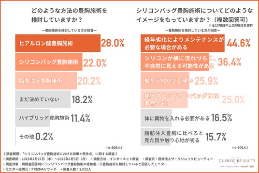 今回の調査で、シリコンバッグ豊胸施術経験者の満足度や、豊胸施術(通称:豊胸手術)を検討している方が希望する方法などが明らかになりました。