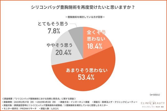 「シリコンバッグ豊胸施術を再度受けたいと思いますか?」と質問したところ、『全くそう思わない(18.4%)』『あまりそう思わない(53.4%)』『ややそう思う(20.4%)』『とてもそう思う(7.8%)』という回答結果になりました。