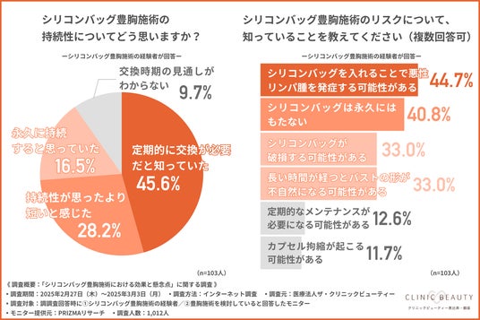 医療法人ザ・クリニックビューティー(所在地:東京都中央区、理事長:山川 謙輔)は、1.シリコンバッグ豊胸施術の経験者/2.豊胸施術(通称:豊胸手術)を検討している方を対象に、「シリコンバッグ豊胸施術における効果と懸念点」に関する調査を実施しました。