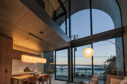 物件内部の最大の特徴は天井高7.5m、109平方メートル の広々とした大空間です。室内には大きなガラス窓が配置され、どの部屋からも海や自然を間近に感じられる設計となっています。
