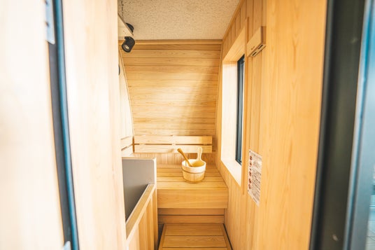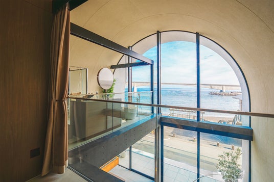 吹き抜けの上部には、サウナとバスルームを完備。宙に浮いているかのような感覚と波音を味わいながら、心身をととのえる極上のリラクゼーションを体感いただけます。