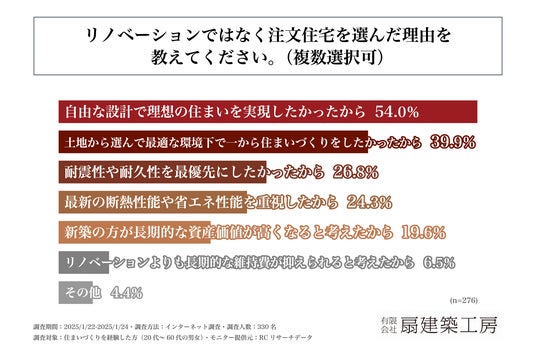 次に、注文住宅の建築で住まいづくりを経験したと回答された方に「リノベーションではなく注文住宅を選んだ理由」を問う設問への回答では、1位が「自由な設計で理想の住まいを実現したかったから」で54.0%、2位が「土地から選んで最適な環境下で一から住まいづくりをしたかったから」で39.9%、3位が「耐震性や耐久性を最優先にしたかったから」で26.8%という結果になりました。この結果から、リノベーションではなく注文住宅を選んだ理由として最も多いのは「自由な設計で理想の住まいを実現したかったから」であることがわかりました。