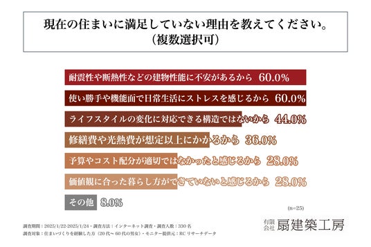 調査の最後、前問の設問で現在の住まいに満足していない(「あまり満足していない」と回答された方を含む)と回答された方に「現在の住まいに満足していない理由」を尋ねる設問への回答で多かったのは、1位が同率で「耐震性や断熱性などの建物性能に不安があるから」と「使い勝手や日常生活にストレスを感じるから」で60.0%、2位が「ライフスタイルの変化に対応できる構造ではないから」で44.0%という結果になりました。この結果から、こうした人が現在の住まいに満足していない主な理由は「耐震性や断熱性などの建物性能」と「使い勝手や機能面で起こる日常生活のストレス」であることが明らかになりました。