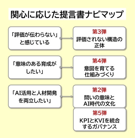 ガイドではこれらを一望できる「思考の地図」「役割別の読み方」「行動にうつす5ステップ」として整理。組織変革の全体像を捉えながら、関心に応じて必要な提言からアクセスできる構成です。