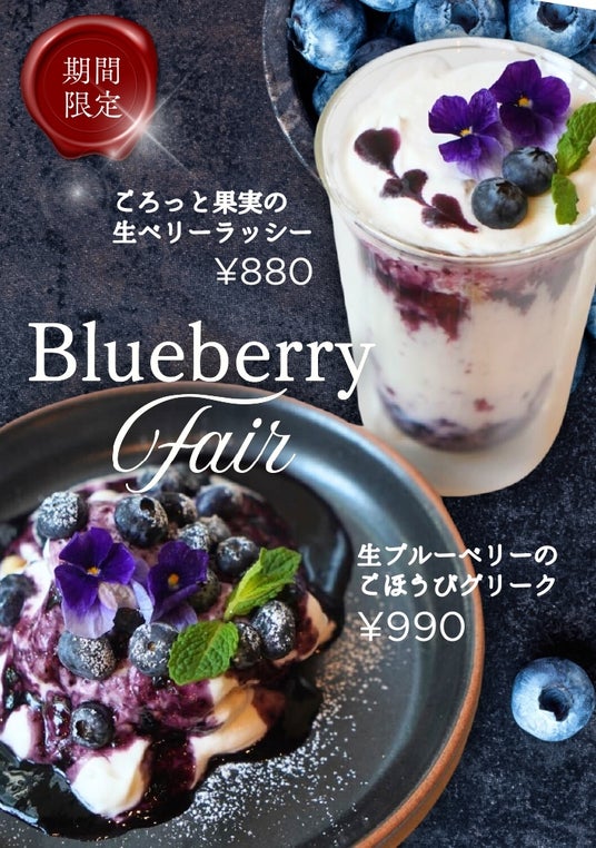 ごろっと果実の生ベリーラッシー&ブルーベリーのごほうびグリーク2種のブルーベリーソースを使い、ブルーベリー本来の甘みと酸味を引き出した果実味のある一杯です。