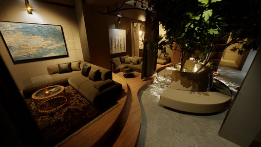 木々に囲まれたアプローチを抜けると、そこには間接照明が優しく灯る、まるで森の中に迷い込んだかのような癒しの空間が広がります。カーテンで仕切られた半個室には、深く沈み込むL字型ソファを配置。木や石の自然素材、丁寧に選ばれたグリーン、そして壁に飾られたアートが、心地よい没入感を演出します。