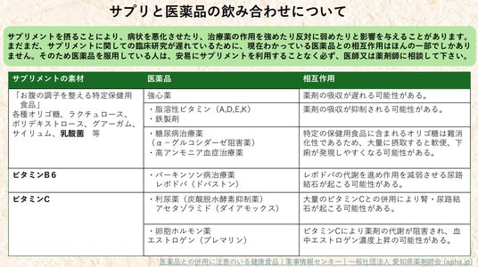 4.成分表: ご年配のお客様が服用されている可能性の高い薬との飲み合わせなどを考慮しサプリの成分表を作成しました。