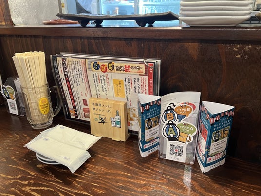 1.三角柱:机の上にある三角柱に酔いのピーク前の人をお手洗いに誘導し、オサケアの存在を認識してもらう。 デザインにはビールのイラストを用い居酒屋の雰囲気に馴染むように調整。 文言は飲みすぎを喚起すると共にお手洗いに誘導する内容としました。