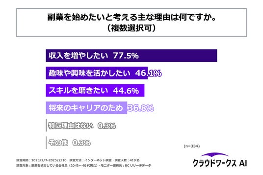 新年度を控えるこの時期、多くの人が新たな目標に向けた準備を進めています。特に近年では、働き方の多様化を背景に「副業を始めたい」と考える人も増えています。その中でもAI技術を活用して収益を上げる副業「AI副業」が注目を集めています。一方で、日本はAIの導入が世界的に見ても遅れていると指摘されており、リテラシーに関する課題が浮き彫りになっています。そこで「クラウドワークスAI」は、副業を検討している会社員を対象に、副業を始める上での課題やAIツールに対するリテラシーの実態、AI活用への意識などを明らかにするべく調査を実施しました。