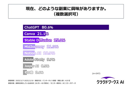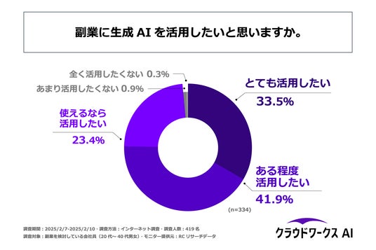 株式会社AI tech(本社:東京都渋谷区、代表取締役:秦 涼一郎)が提供する「クラウドワークスAI」は、副業を検討している会社員の方を対象に「副業とAI活用」に関する調査を実施しました。この調査結果から20代~40代の会社員の副業とAIに関する意識やAIの活用実態等が明らかになりました。