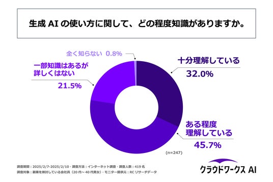生成AIに関心があり、副業を検討している20代~40代会社員で、生成AIを利用した経験がある人の約8割が、生成AIの使い方をある程度理解している