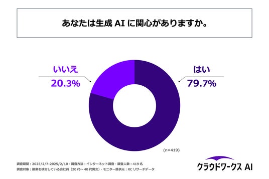まず、「生成AIに関心があるか」を尋ねる設問への回答では、「はい」が79.7%、「いいえ」が20.3%という結果になりました。この結果から、副業を検討している20代~40代の会社員の約8割が生成AIに関心があることがわかりました。