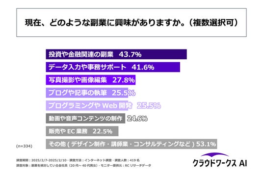 生成AIに関心があり、副業を検討している20代~40代の会社員が興味を持っている副業トップ3は、1位「投資や金融関連の副業」、2位「データ入力や事務サポート」、3位「写真撮影や画像編集」