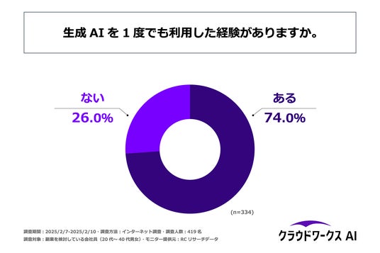 また、生成AIに関心があると回答された方に「生成AIを1度でも利用した経験があるか」を尋ねる設問の回答では、「はい」が74.0%、「いいえ」が26.0%という結果になりました。この結果から、副業を検討している20代~40代の会社員の7割強が、過去に生成AIを利用した経験があることがわかりました。