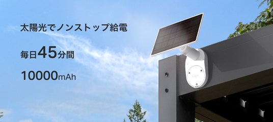 *1:45分間の太陽光給電は標準的な環境条件(1000W/平方メートル ・25°C・AM1.5)および1日あたり最大300秒間使用した場合のテスト結果に基づいています。実際の給電性能は、設置角度・気象条件・カメラの使用状況によって異なる場合があります。