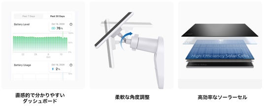 「Tapo C460 KIT」に付属するソーラーパネルは、直感的で視認性の高いダッシュボード機能を備えており、日々の発電状況やバッテリーの使用状況をリアルタイムで把握することが可能です。ユーザーはデータに基づき、ソーラーパネルの向きやカメラの設定を最適化することで、さらなる発電効率の向上を図ることができます。ソーラーパネルは可動式の台座を採用しており、壁面や天井など多様な設置場所に柔軟に対応。太陽光を効率的に取り込める角度に調整できるため、安定した電力供給を支える設計となっています。パネルには高効率な単結晶シリコンセルを採用しており、従来製品と比較して優れた光吸収性能を発揮。より多くのエネルギーを取り込むことで、フルワイヤレスかつメンテナンス性の高い監視環境を実現します。