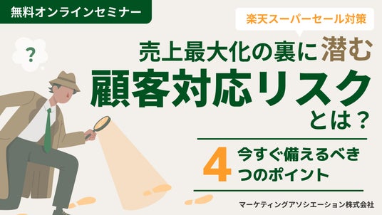 マーケティングアソシエーション株式会社(本社:東京都台東区 代表取締役:中園広和、以下当社)は2025年5月14日(水)に、ウェブセミナー「【楽天スーパーセール対策】 売上最大化の裏に潜む顧客対応リスクとは?今すぐ備えるべき4つのポイント」を、開催いたします。
