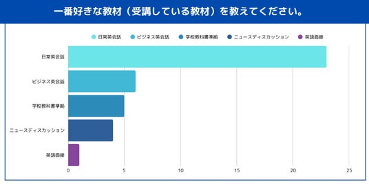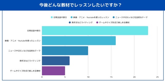 今後の教材についてのアンケートでは、最も多くの生徒が希望したのは「日常英会話」や「旅行会話」をテーマにしたレッスンでした。実際に日常の英会話や海外旅行で使えるフレーズを学べることが、多くの受講生にとって魅力的なポイントであることがわかります。