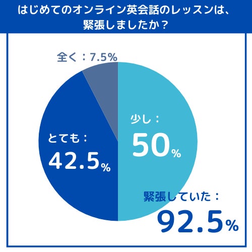 ●はじめてのオンライン英会話で緊張したのは92.5%だが、受講継続することで97.5%が「緊張が減った」と回答