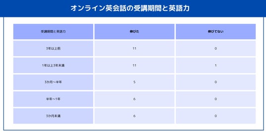 今回の調査では、受講歴が1年以上の受講生が全体の約6割を占めました。中には3年以上続けている生徒もおり、継続的な学習の姿勢がうかがえます。一方で、1年未満の生徒も約4割おり、新しく始めたばかりでも「英会話力が伸びた」と実感する声が多く寄せられました。