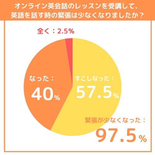 英語を話すことに対して「初回レッスンは緊張した」と回答した受講生は92.5%にのぼりました。しかし、その後レッスンを継続する中で、97.5%が「緊張が少なくなった」と感じていることがわかりました。