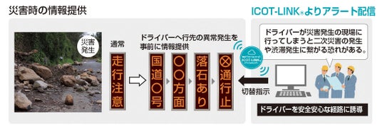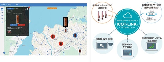 本サービスは、各種IoTセンサーやIoT表示デバイス(LED表示板など)から得られる情報を集約・解析し、製品やシステムの一括遠隔監視や、計測値と連動した遠隔制御を可能にするものです。これにより、災害時の道路管理・監視業務の省人・省力化が図れ、防災・減災への貢献が期待されます。