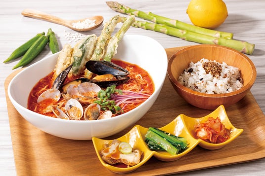 また、江戸菜の麹和え、旨辛韓国風鶏チャーシュー、キムチの3種の小鉢のついたセットもご用意。〆には、残ったスープをかけてリゾット風に楽しめるヘルシーな十八穀米の「らぁリゾ」、果実発酵酢のサワー、トマトジュレを載せたレアチーズのデザートなどもお好みでセットとしてお選びいただけます。太陽のトマト麺はこれからも「美味しくて健康的」な食事をお届けしていきます。