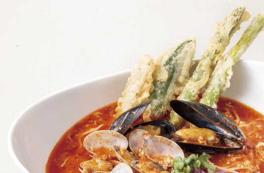 『季節野菜フリットの米麹トマト麺』は、米麹を使用した、体にも嬉しいトマト麺です。米麹と合わせて一晩寝かせることで、ふくよかな甘みと旨味を備えた特製トマトソースが完成。そこに、あさりとムール貝のスープを加えることで、奥行きのある味わいに仕上げました。あさりやムール貝は殻ごとトッピングし、さらに米粉を使用して軽やかなフリットに仕上げたアスパラガス、オクラ、ごぼうなどの季節野菜を添えることで、彩りもばっちり。旬の野菜と米麹に含まれる栄養素や食物繊維が、腸内環境を整えます。