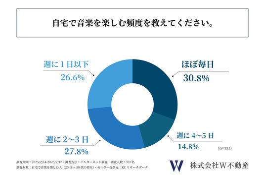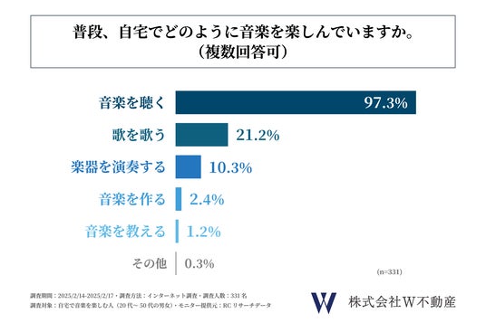 株式会社W不動産(本社:東京都港区、取締役社長 渡邉 庄二)が運営する「Wレジデンス多摩川」は、自宅で音楽を楽しむ人を対象に「自宅で音楽を楽しむ人の実態調査」を実施しました。この調査結果から、自宅で音楽を楽しむ人の自宅での音楽の楽しみ方の実態や、防音・騒音に対する意識等が明らかになりました。