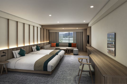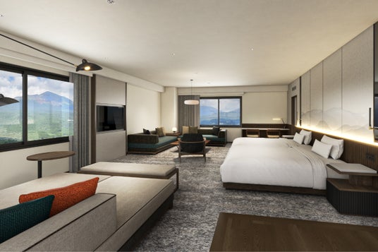 窓からは雄大な景色が望め、陽の光がさしこむ明るい客室です。部屋の内装や照明は落ち着いたトーンにし、くつろげる空間に。幅広いベッドでゆっくり休める洋室ツインルーム、ベッドのほかに和室がついた和洋室タイプのお部屋を数多く揃えているほか、スイートルームやファミリールームなど、大人数で快適に過ごせる広さの部屋も充実しています。
