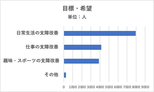 目標・希望を尋ねたところ(複数回答可)、「日常生活の支障を改善したい」と答えた人が7967人で、76%を占めました。次いで「仕事の支障改善」が39%、「趣味・スポーツの支障改善」が37%となりました。