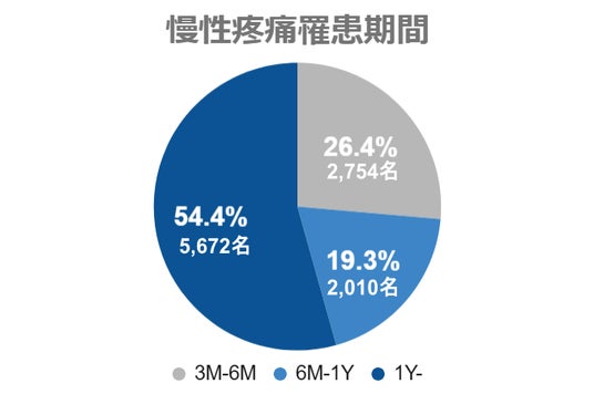 この慢性疼痛罹患者を対象に、痛みの期間について尋ねたところ、1年以上と答えた人は約半数で、このうち23%が5年以上の長期にわたり日常的な痛みを我慢していることがわかりました。