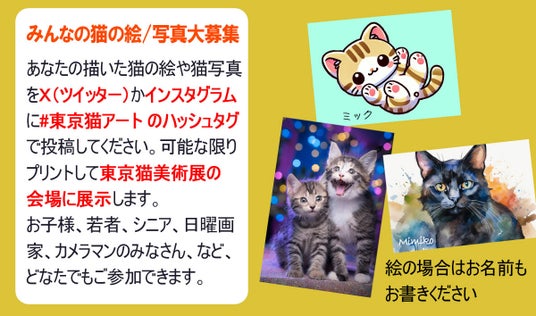 X(旧Twitter)やインスタグラム(Instagram)で「#東京猫アート」をつけて猫の絵や写真を投稿してください。約300枚の作品を、ハガキサイズにプリントして会場に展示します。