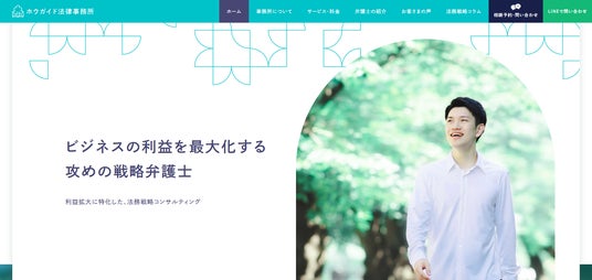 今回のWebサイト制作では、ホウガイド法律事務所様が掲げる「攻めの法務」の考え方とともに、代表のお人柄が伝わる爽やかな印象をデザインに反映いたしました。