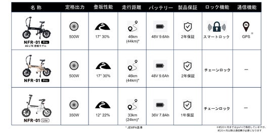 また、今回のNFR-01 Lite発売と併せて、これまで販売していたNFR-01Proの登坂性能等はそのままに、通信機能非搭載のモデル NFR-01Pro を4月から予約開始予定です。