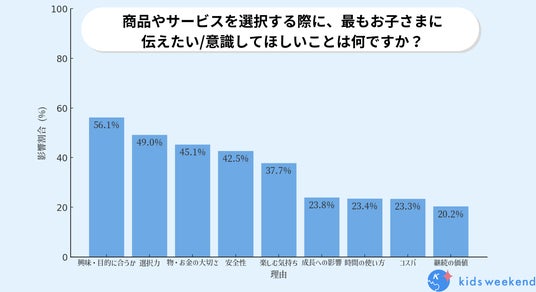 子どもに伝えたい・意識してほしいこととして最も多かったのは、「興味・目的に合うか」(56.1%)であり、保護者は子ども自身が目的を持って選択する力を身につけてほしいと考えていることがわかりました。次いで、「自分で選ぶ力を育てたい」(49.0%) 「物やお金を大切にする気持ち」(45.1%)「安全性」(42.5%)といった要素が続き、責任感やリスク管理の意識を持つことを求めていることが分かります。また、「楽しむ気持ちを大切にする」(37.7%)という回答も多く、子どもが学びや経験をポジティブに捉えることの重要性が示されました。