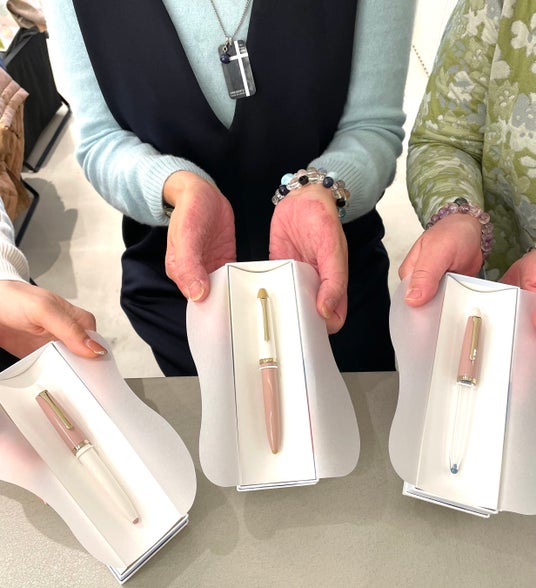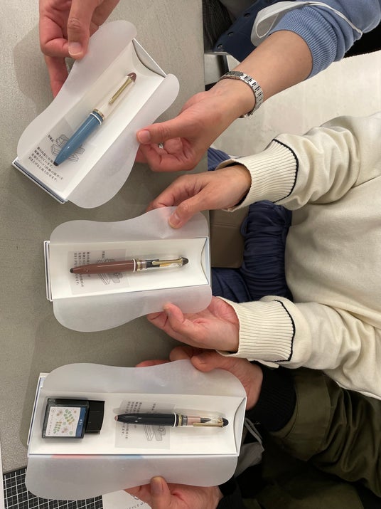 福岡と東京をオンラインで結んだシミュレーションでは、参加者の方から「まるで店舗にいるような臨場感で楽しめた」と嬉しい感想をいただきました。この特別な体験を、もっと多くの方と共有したいと思っています。オンラインで結んだリモート万年筆ビュッフェのシミュレーションでは、小さいお子様とご一緒に参加して頂き、お二人で万年筆のパーツの色をお選びいただきました。