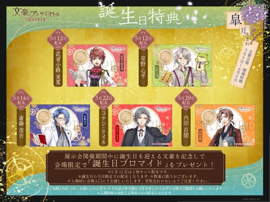 展示会開催期間中に誕生日を迎える文豪の「誕生日ブロマイド」を当日限定でお渡しします。