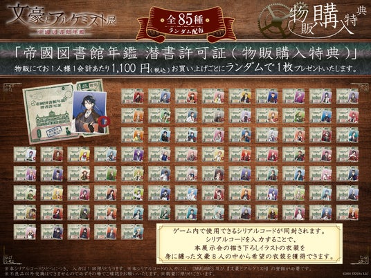 おひとり様1会計あたり1,100円(税込)お買い上げごとに、「帝國図書館年鑑 潜書許可証(ランダム全85種)」を1枚お渡しします。ゲーム内で使用できるシリアルコードが同封されています。