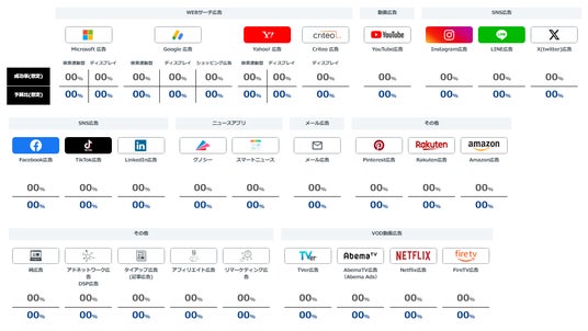 日本のオンライン/オフラインの広告媒体を網羅しています。予算も設定することでどの媒体に対してより効果を高められるかの配分割合も算出します。