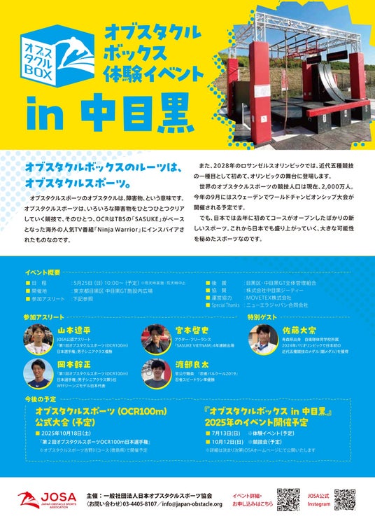 2025年春には、東京都目黒区にも設置され、今後、デモ大会・公式大会などのイベントを開催し、オブスタクルスポーツの情報発信をしてまいります。