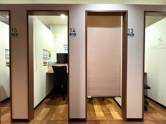 5室ある半個室も広々したデスクでモニター完備。ロールカーテン付きのため、完全個室と同様に周囲を気にせずに、ご利用いただけます。