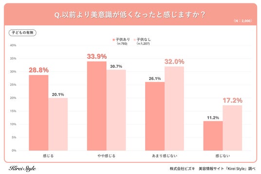 子どもの有無で見ると、美意識が低くなったと「感じる」方は「子どもあり」に、「感じない」方は「子どもなし」に多くなりました。