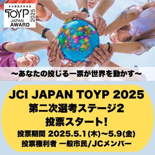 公益社団法人日本青年会議所(所在地:千代田区麹町2丁目12-1 VORT半蔵門7F、会頭:外口 真大、以下「日本JC」)が主催する「JCI JAPAN TOYP 2025」(第39回青年版国民栄誉賞)では、本日5月1日(木)より、第二次選考ステージ2の一般WEB投票の受け付けを開始いたしました。