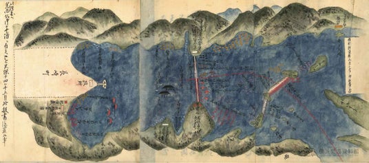 2. 来航を許されなかった外国船を取り囲むようす正保4(1647)年6月、貿易の再開を求めて来航したポルトガル使節ソウザを乗せた外国船を、諸藩の船・軍勢が包囲する様子を描いています。長崎には来航を許されなかった外国船の訪れが多くありました。絵図面は熊本藩の関係者が作成した古文書の綴りに添付されていたものです。