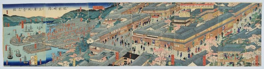 3. 浮世絵に描かれた長崎市街と丸山遊廓この資料を描いた五雲亭貞秀は横浜でも多くの浮世絵を描いた人物です。本資料は右側に長崎の遊廓街(丸山遊廓)を、左手に長崎の町と出島を描いています。見ごたえのある貞秀の名品です。遊廓は長崎でも横浜でも名所となりました。