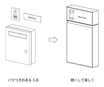 Post(郵便受け)とPanel(インターホンパネル)の幅、奥行、素材、色を統一することで、すっきりとした印象をもたらします。