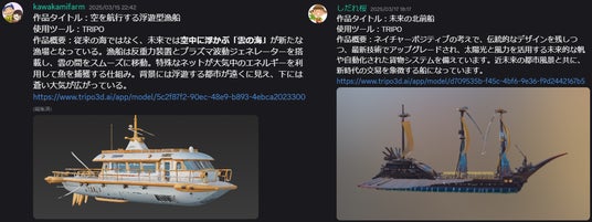 本コンテストは、テキストや画像から3Dモデルを自動生成するAI技術を活用し、「未来の漁船」をテーマに革新的なアイデアを募集したものです。AIツールの活用を前提とすることで、3D制作の専門知識がない方でも気軽に参加できる設計とし、Z世代や異業種を含む多様なバックグラウンドを持つ参加者から独創的な作品が多数寄せられました。コミュニティ投票により、機械学習研究者でもあるYuusuke Harada氏がAIでデザインした『ネオ・クラゲ初号機』が選ばれました。