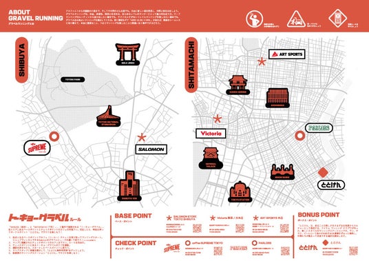 昨年開催された「シブヤトレイル」に続くロゲーニングイベントの第二弾になります。「トーキョーグラベル」ではSHIBUYA(渋谷)エリアだけでなくSHITAMACHI(下町)エリアまで拡大。各エリアにあるベースポイントとチェックポイントのカフェを往復するランイベントです。
